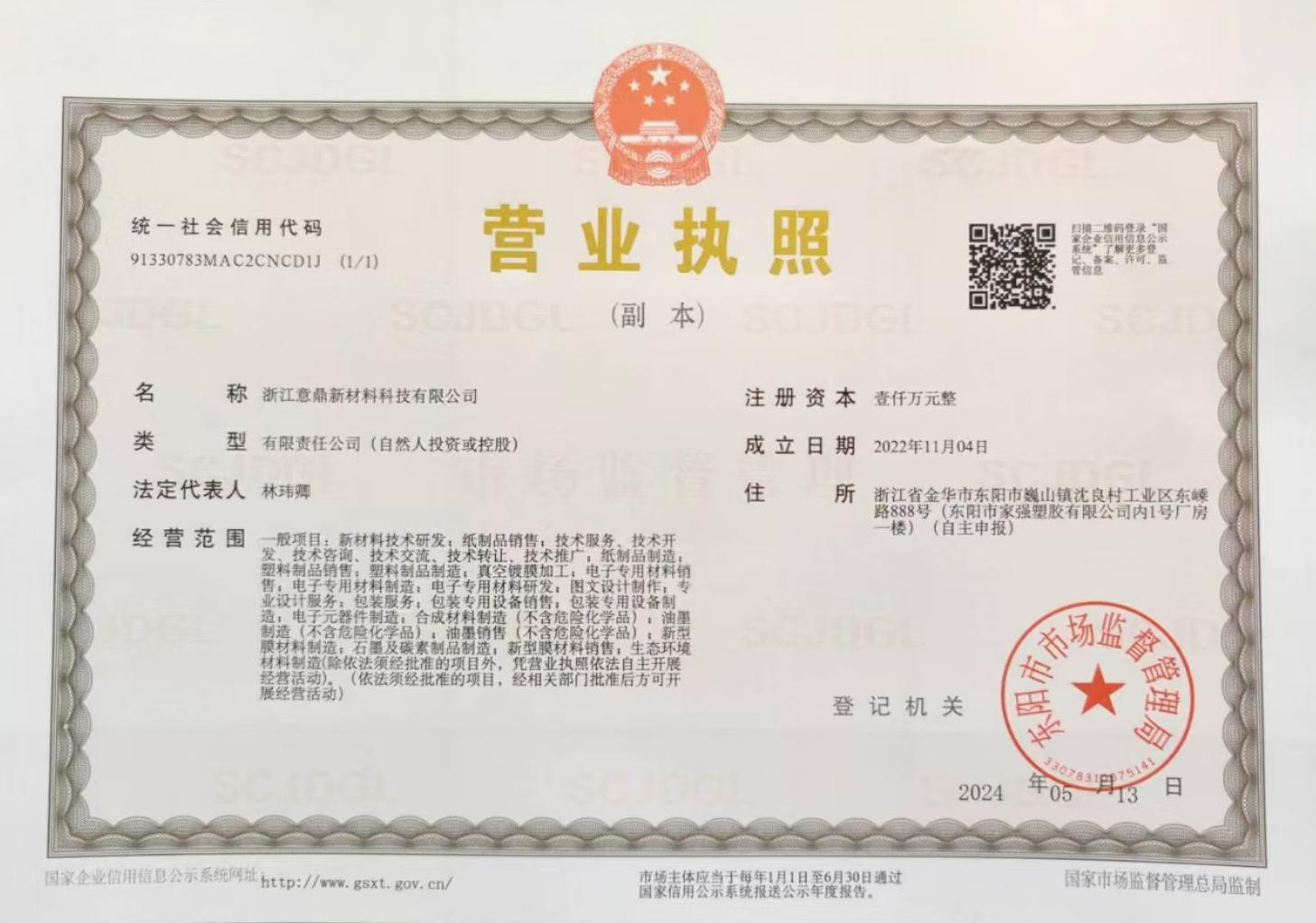 浙江意鼎新材料科技有限公司利用位于浙江省金华市东阳市巍山镇沈良村工业区东嵊路888号的现有厂房,2022年11月注册资金实缴1000万,自主设计研发UV模压机8台、购置高速分切电晕机6台、镀铝机3台、高速涂布复合机5台、定位断切机6台等备,项目总占地面积50亩,总建筑面积60000平方米,项目建成后将形成年产1.2万吨定位纸、5000吨定位膜和3-4亿个印刷品的生产规模。项目已在东阳市发展和改革局备案,项目代码为2303-330783-04-01-377753。